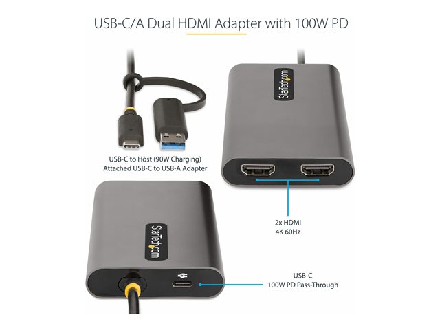 StarTech.com USB-C to Dual-HDMI Adapter, USB-C or A to 2x HDMI, 4K 60Hz, 100W PD Pass-Through, 1ft (30cm) Built-in Cable, External Video Graphics Adapter